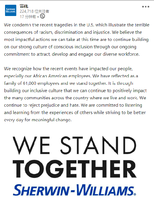獲悉,全球涂料巨頭美國(guó)宣偉(Sherwin-Williams)今日發(fā)表聲明稱, 我們譴責(zé)最近發(fā)生在美國(guó)的悲劇,這表明了種族主義、歧視和不公正的可怕后果。