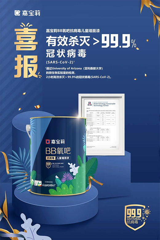 早在2019年,我們已經(jīng)聽聞嘉寶莉抗病毒涂料專項(xiàng)研發(fā)團(tuán)隊(duì),投入重金來對(duì)Corning Guardiant? 技術(shù)抗病毒涂料產(chǎn)進(jìn)行研發(fā),而Corning Guardiant?作為抗微生物添加劑在美國(guó)環(huán)境保護(hù)署(美國(guó)環(huán)保署)注冊(cè),是一種抗微生物銅離子技術(shù),密封了銅最活躍的抗微生物狀態(tài),并能控制銅離子的釋放,殺死病毒和細(xì)菌。需要知道的是,銅是人體所必需的微量元素之一,也是制造各種日常生活器具的主要原料之一,如在產(chǎn)品配方設(shè)計(jì)上使用銅離子為活性成分,從源頭上就可以減少非安全原料對(duì)人體的傷害,打造更安心的生活環(huán)境。在結(jié)合該項(xiàng)頂尖技術(shù)的同時(shí),嘉寶莉旗下“BB氧吧抗病毒兒童墻面漆”產(chǎn)品采用凈味無添加配方來確保揮發(fā)性有機(jī)化合物等有害物質(zhì)釋放量達(dá)到極低水平,氣味更清新。同時(shí),產(chǎn)品更通過了美國(guó)UL GREENGUARD室內(nèi)空氣質(zhì)量金級(jí)認(rèn)證、法國(guó)室內(nèi)環(huán)境空氣檢測(cè)A+標(biāo)準(zhǔn)、EN71-3歐盟玩具安全標(biāo)準(zhǔn)、兒童漆國(guó)家標(biāo)準(zhǔn)等權(quán)威認(rèn)證。