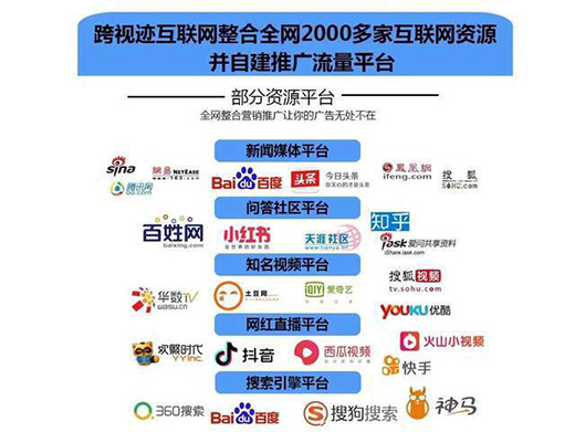 通過借力跨視跡互聯(lián)網(wǎng)推廣流量云推廣平臺(tái),跨視跡云推廣推廣平臺(tái)整合2000 多家互聯(lián)網(wǎng)資源平臺(tái),涵蓋全網(wǎng)全媒體資源、大數(shù)據(jù)以及移動(dòng)互聯(lián)網(wǎng)資源媒體、網(wǎng)紅小紅書資源。