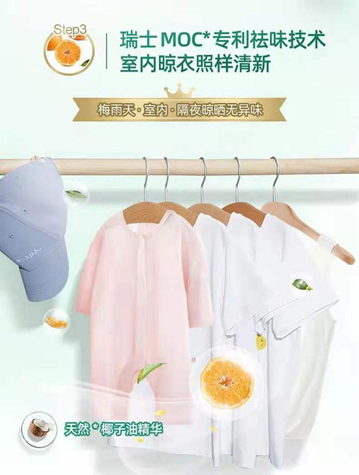 除了優(yōu)秀的清潔能力之外,這款除菌除螨除味親膚洗衣液還有著獨(dú)家的去味黑科技。我們常常因?yàn)樵诿酚晏欤幪炝罆褚挛?,而?dǎo)致衣物上產(chǎn)生難聞的異味,使用這款除菌除螨除味親膚洗衣液就能輕松解決這個(gè)問(wèn)題。這是因?yàn)檫@款洗衣液采用了來(lái)自瑞士的MOC專利祛味技術(shù),即使是在梅雨天或者室內(nèi)晾曬,也能讓每件衣物無(wú)懼晾曬環(huán)境,隨時(shí)保持清新自然的松木柑橘香味。