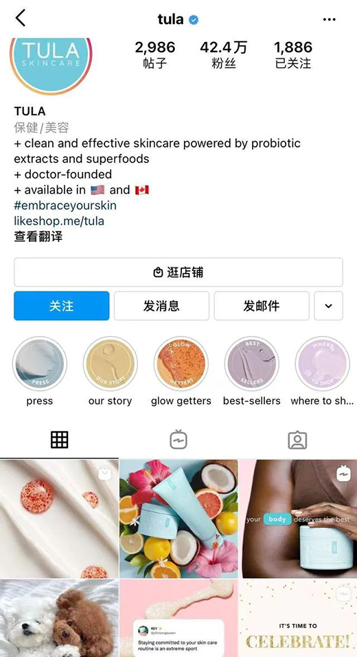 值得注意的是,Tula 品牌非常擅長(zhǎng)網(wǎng)紅營(yíng)銷,主要集中在UGC內(nèi)容上,75%的消費(fèi)者是通過(guò)社交媒體發(fā)現(xiàn) TULA 的。