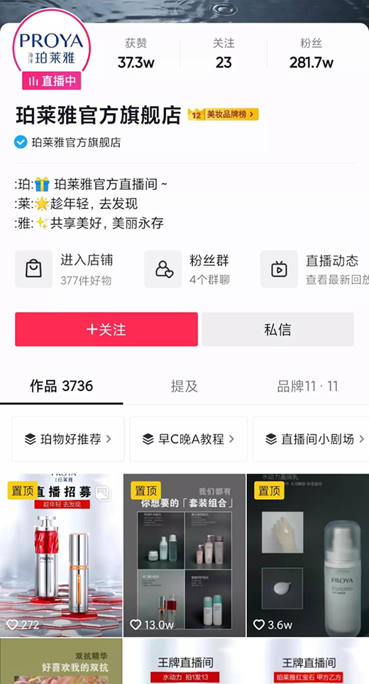 當(dāng)其他品牌仍在猶豫是否開(kāi)啟自播時(shí),珀萊雅官方賬號(hào)在抖音平臺(tái)已坐擁百萬(wàn)粉絲。