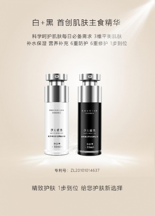 伊人唯本把復雜的東西簡單化,把繁瑣的過程便捷化,用科技帶領時尚,讓護膚變得便捷、高效!其主要的產(chǎn)品白+黑精華就是這樣一瓶致勝的精華!白瓶白天使用,主打補水保濕,6重防護,日常抵御外界污染間接損傷皮膚;黑瓶晚間修護,維穩(wěn)強韌肌膚,黑白聯(lián)合作用,不僅保證日常肌膚基本營養(yǎng),還能進一步增強肌膚屏障,維穩(wěn)抗老。