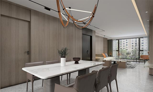 餐廳一側(cè)的墻面用的是同色系的護(hù)墻板,餐椅的選擇也是棕色,但是白色大理石餐桌打破了整個(gè)空間的視覺(jué),讓人眼前一亮。