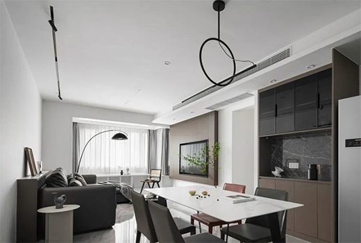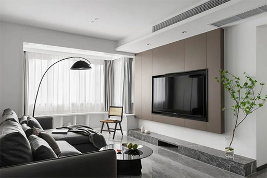 客廳以溫暖的咖色和白色為基底,整個色調較為沉穩(wěn),吊頂?shù)臒o主燈設計,采用現(xiàn)在流行的隱藏筒燈,讓空間看起來更簡約,燈光的光照不刺眼。