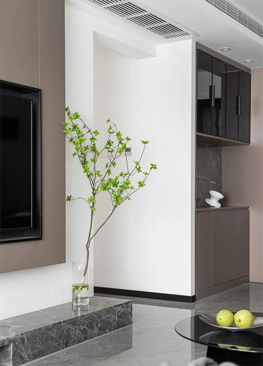 客廳電視背景墻與餐邊柜采用同樣的咖色系,讓現(xiàn)代簡約體現(xiàn)得淋漓盡致。