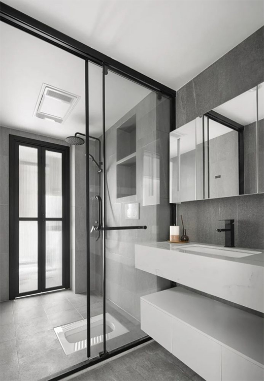 簡約的灰色大理石墻面,素凈簡潔,客衛(wèi)通往陽臺的窗戶打通做一扇長虹玻璃折疊門隔開,在動線上生活陽臺與客衛(wèi)互通,減少了行動路徑更加方便了業(yè)主的起居生活。