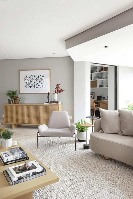圍合型擺放的沙發(fā),大氣時(shí)尚,來(lái)人會(huì)客也非常方便!底下再鋪上巨大的地毯,和沙發(fā)同色系,溫馨有檔次。