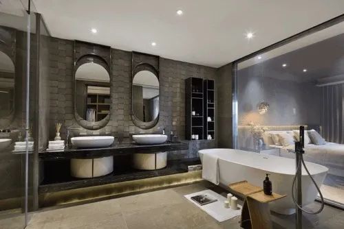 衛(wèi)生間可以通過調(diào)節(jié)主燈與周邊射燈切換氛圍。有的人喜歡更亮,有的人也許喜歡暗一點(diǎn),讓衛(wèi)生間看起來也高級感十足!