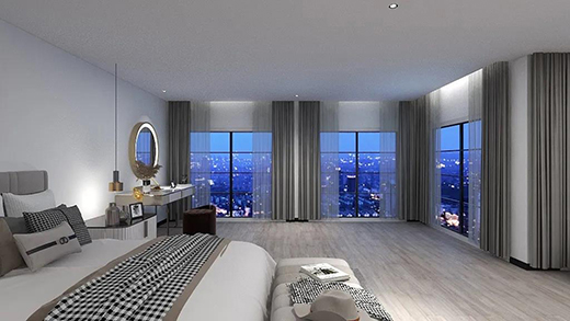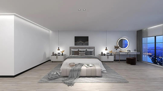 臥室的活動(dòng)需求不高,設(shè)計(jì)燈光時(shí),切忌太亮。下面這個(gè)案例臥室面積較大,沒有鋪過多的光源,更注重光的美感與氛圍打造。