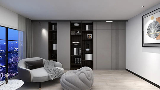床尾閱讀區(qū)用磁吸軌道燈照明,射燈頭為閱讀提供專注的亮度,可以悠閑地在沙發(fā)上看書,泛光條則為書柜提供基礎(chǔ)照明。磁吸光源可以在軌道上靈活移動(dòng),更換沙發(fā)布局時(shí),燈光也能跟著移動(dòng)。