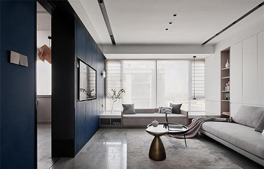 此戶型空間層高很高而梁過低,所以頂部采用無主燈設(shè)計(jì),運(yùn)用大面積吊平頂?shù)氖址ㄈト趸謱捰值偷拇罅?,黑色線條貫通南北,簡約通透的格局規(guī)劃中將藝術(shù)滲透進(jìn)生活里。