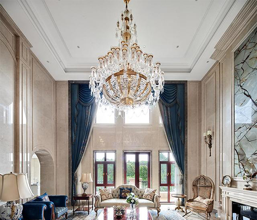 繁復(fù)精致的黃銅水晶吊燈與經(jīng)典歐式墻壁鑲邊,展現(xiàn)引人駐足的奢華布局手法,而置身其中的典雅大氣的家具,更凸顯空間的新古典韻味。