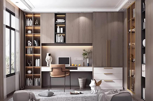 1.書(shū)房是閱讀、工作、學(xué)習(xí)的場(chǎng)所,因此要保留自然光源,又要設(shè)置燈具照明,還要注意保護(hù)視力,讓使用者有一個(gè)舒適、明亮的空間,享受幽靜的閑適感