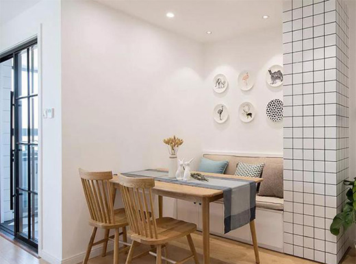 沙發(fā)一側(cè)借用墻柱打造卡座餐桌,潔白墻面以動物圖案盤子做裝飾,生動有趣,原木餐桌椅,頂部射燈映射下倍感溫暖解壓。