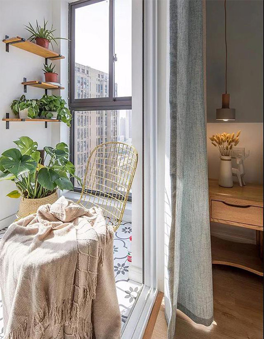 主臥淡藍(lán)色半墻拼接,呼應(yīng)布藝遮光窗簾,和諧統(tǒng)一,實(shí)木床體搭配兩側(cè)小巧床頭柜+線狀吊燈平添一份文藝安靜的休息氛圍。同時改造陽臺位置地面花磚,鏤空金色背椅,墻面懸掛實(shí)木隔板擺放綠植,沐浴陽光閑坐放松,舒適安心。