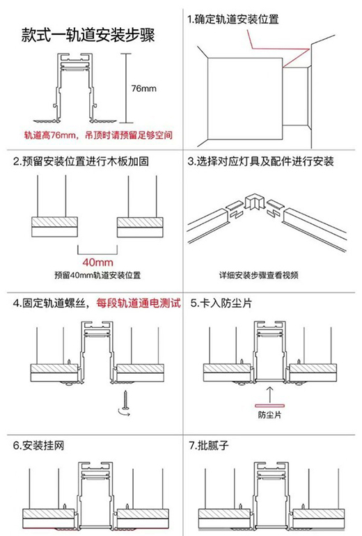 嵌入式軌道:嵌入式軌道是暗裝在吊頂內(nèi)的軌道,這樣的軌道安裝必須要有吊頂?shù)呐浜?,這里需要注意一下軌道的寬度,一般有40MM和25MM兩個(gè)尺寸,40MM多用于公裝設(shè)計(jì),家用建議選擇25MM。