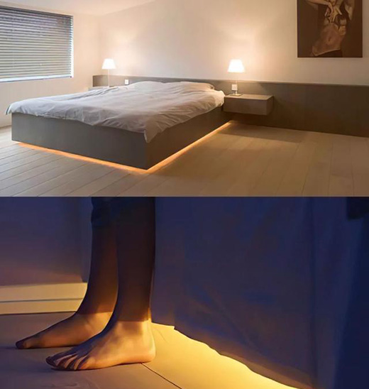床頭不裝射燈,還可以用燈帶來(lái)做間接照明,一方面能夠起到裝點(diǎn)的作用,另一方面也能夠滿足日常的功能性照明,燈帶可以為臥室提供很好的氛圍感,對(duì)于一些大面積使用肌理造型的墻面來(lái)講,這種照明方式可以突出肌理層次感,防眩效果也是非常好的。間接光不僅可以安裝在天花上,還可以在墻面使用,比方說(shuō)在床靠背后設(shè)置往上照射的燈帶,可以產(chǎn)生豐富的光源層次。除了床頭照明,燈帶還可以作為起夜燈,在床下設(shè)置一盞超低照度和色溫的感應(yīng)燈帶,方便起夜使用。