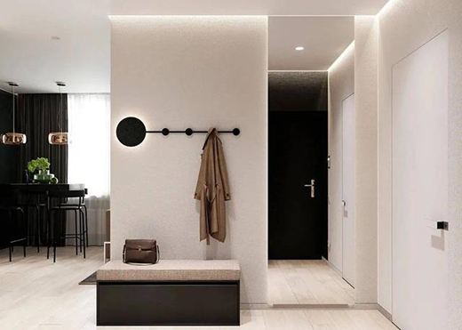 玄關(guān)作為室內(nèi)外的一個(gè)緩沖區(qū),空間比較狹小,在燈光上可以選擇筒燈、射燈、燈帶,在鞋柜上做感應(yīng)式燈帶給晚歸的人提供一個(gè)方便的照明。