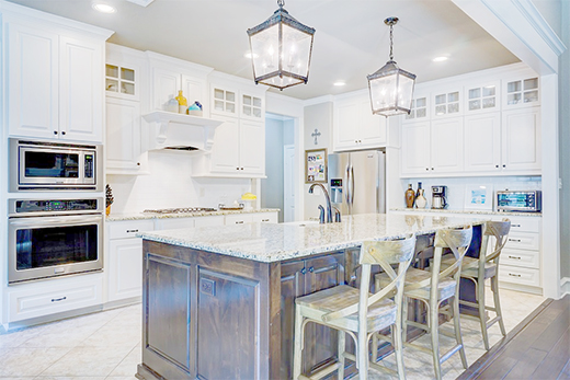 餐廳與廚房因?yàn)橥ǔT谖锢砭嚯x上比較近,在設(shè)計(jì)上也比較統(tǒng)一,可選擇頂面分散2~4個(gè)筒燈,外加燈線或燈帶的組合方式。