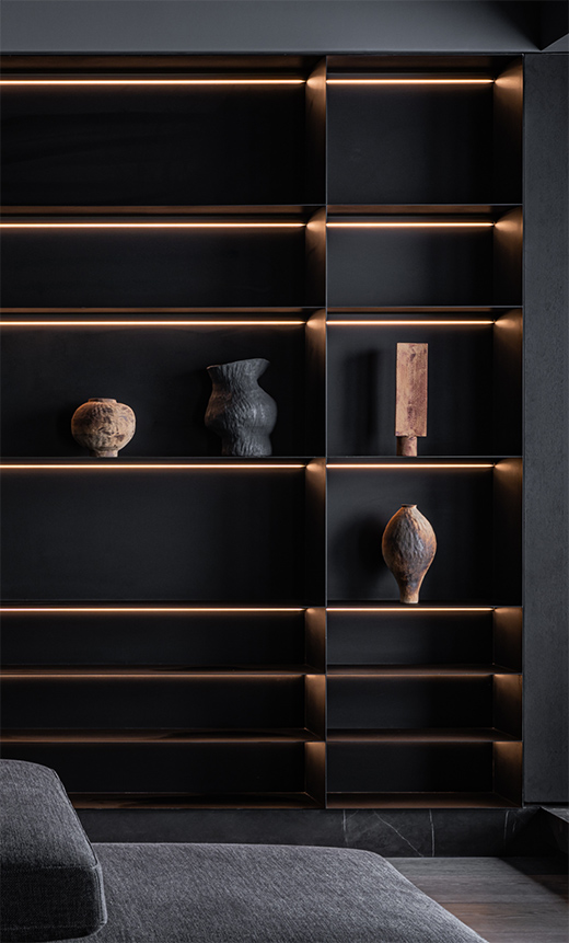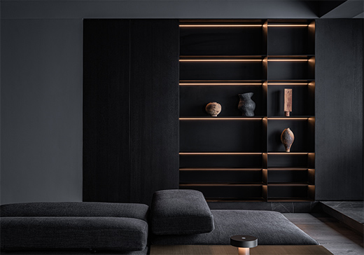 在空間下游走,柔和的光灑下,或遠(yuǎn)或近,忽明忽暗,既溫柔又熾烈。會(huì)客廳的光線層次需求比較多,燈槽燈通過漫反射間接照明拉伸空間。小開孔無邊預(yù)埋款射燈與天花的融合,既不破壞天花整潔,又彰顯了家居的品味。