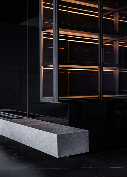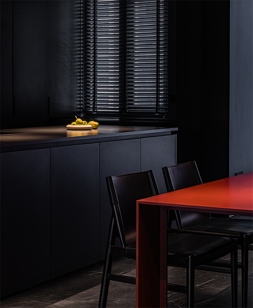 紅色的餐桌以及艷麗的冬青,以熱情的姿態(tài)喚醒沉睡的黑色廚房,設(shè)計(jì)師通過燈光,突顯材質(zhì)本色。