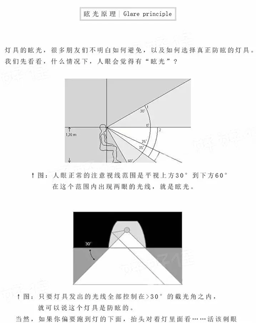 眩光簡(jiǎn)單的來(lái)說(shuō)就是會(huì)刺眼的光線,會(huì)讓人感覺(jué)到不舒服的光線,就算是再深防眩光的射燈,在射燈正下方也一樣會(huì)有眩光,在設(shè)計(jì)燈光的時(shí)候,所有射燈的光線都要經(jīng)過(guò)設(shè)計(jì),不能直射。
