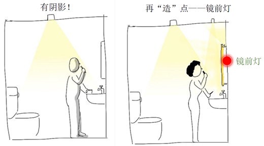 對(duì)于衛(wèi)生間照明,很多家庭就在頂部安裝了一個(gè)主燈,由于投光原理,很多邊角位置有陰影,比如洗漱臺(tái)的化妝鏡最好安裝局部的燈帶或者筒燈來(lái)補(bǔ)光。