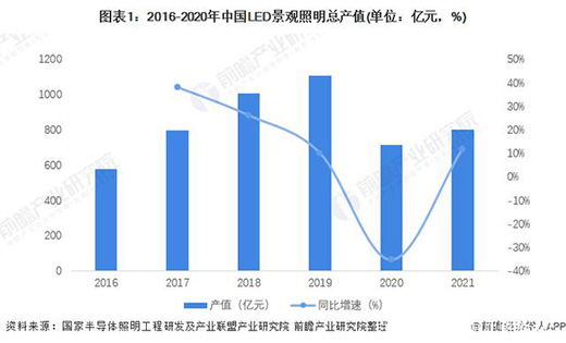 2020年,新冠疫情席卷全球,中國(guó)LED照明產(chǎn)業(yè)整體產(chǎn)值下降,細(xì)分行業(yè)中僅有通用照明作為剛需行業(yè)產(chǎn)值保持穩(wěn)定,景觀照明行業(yè)產(chǎn)值為716億元,較2019年下降35%,占LED照明應(yīng)用市場(chǎng)的12%。2021年國(guó)內(nèi)疫情得到控制,景觀照明行業(yè)產(chǎn)值回升至800億元左右。