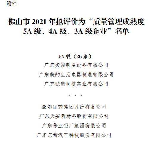 近日,佛山市2021年企業(yè)質(zhì)量管理成熟度評價結(jié)果公示,全市共有92家企業(yè)上榜,廣東偉業(yè)鋁廠集團有限公司位列其中,獲評“佛山市2021年企業(yè)管理成熟度5A級企業(yè)”。