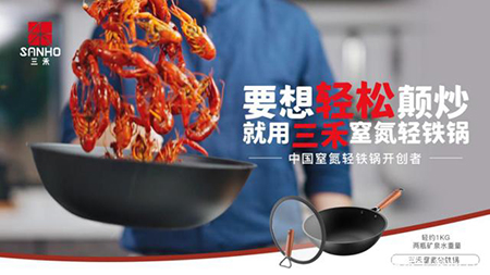 三禾鍋具旨在為中國家庭帶來輕松健康的烹飪環(huán)境,爆款三禾窒氮輕鐵鍋僅重1kg,兩瓶礦泉水的重量,即使是力量弱的女士和老人都能做到單手顛炒;同時,鍋身采用雙層復(fù)合鐵結(jié)構(gòu),外鋁內(nèi)鐵的金屬結(jié)合,使得鐵鍋既有鋁輕巧、導(dǎo)熱快的特性,又有著99.6%純鐵健康、耐用的優(yōu)勢,三禾窒氮輕鐵鍋上熱快、受熱均勻,鍋底與鍋壁的溫差小,因此避免食物下鍋因大溫差而導(dǎo)致出現(xiàn)油煙的狀況;此外,抗銹耐磨也是窒氮輕鐵鍋的一大優(yōu)勢,采用了三禾鍋具獨(dú)家窒氮專利,鍋身的氮化層達(dá)到25-30微米,是普通鐵鍋的3-4倍,防銹能力強(qiáng),一口鐵鍋可傳家。
