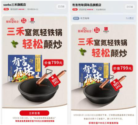 活動期間,三禾鍋具與新希望味業(yè)開展以“有言有味,輕松享”為主題的深度合作,送出“三禾窒氮輕鐵鍋+有言有味調(diào)味品”的組合大禮包,兩大品牌線上旗艦店購物可參與折扣與買贈活動。