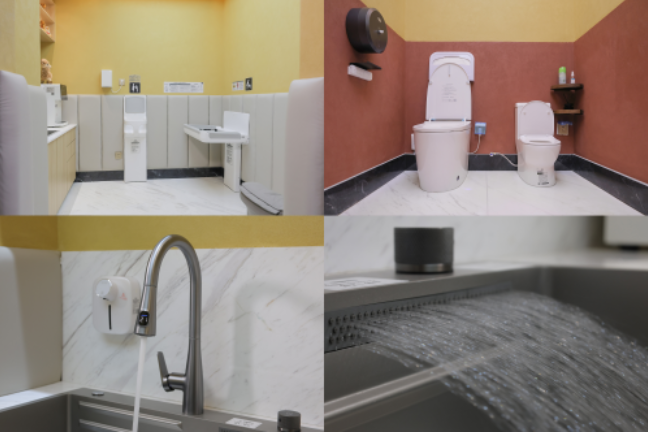 茶歇區(qū)配置九牧多功能水槽,集砧板、置物槽、瀝水板、洗杯器及感應抽拉龍頭等一體式設計,便利沖洗,分區(qū)操作,讓游客暢享舒適。母嬰室配備嬰兒護理臺、嬰兒座椅、水槽,第三衛(wèi)生間、無障礙衛(wèi)生間人性化設置兒童小便器、兒童馬桶及各類扶手,讓不同群體都能在此從容如廁。