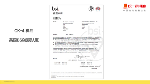 統(tǒng)一CK-4系列機(jī)油還是中國(guó)為數(shù)不多獲得英國(guó)BSI“減碳潤(rùn)滑油”認(rèn)證的產(chǎn)品,與市場(chǎng)上同類產(chǎn)品相比,該系列產(chǎn)品更低碳、更環(huán)保,包含鈦粒王系列T10/T8/T7柴油機(jī)油等產(chǎn)品。