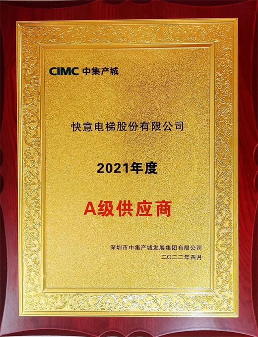 榮耀加冕,再添新彩丨快意電梯榮膺2021年度中集產(chǎn)城A級供應商