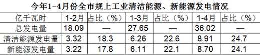 1-4月全市規(guī)上工業(yè)清潔能源(綠電)發(fā)電8.91億千瓦時(shí),同比增長5.1%,較1-3月加快4.1個(gè)百分點(diǎn),新能源發(fā)電8.70億千瓦時(shí),同比增長5.0%,較1-3月加快4.2個(gè)百分點(diǎn),清潔能源發(fā)電量、新能源發(fā)電量分別占總發(fā)電量的24.7%、24.1%,比例較1-3月、1-2月提高。
