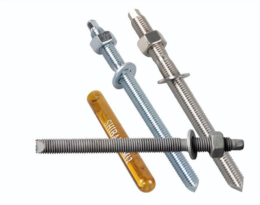 先說說普通化學錨栓,它是由螺桿、螺母、墊片以及化學膠管組成,受力作用是通過化學膠粘劑形成錨固作用,與它配套的化學膠管是一種玻璃管式包裝,其主要成分是乙烯基樹脂、石英砂顆粒和固化劑,玻璃可以充當細骨料,對錨固作用沒有影響。