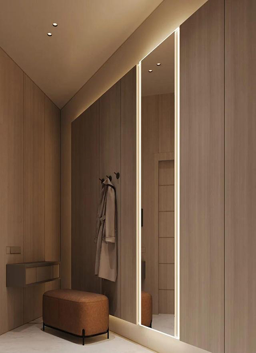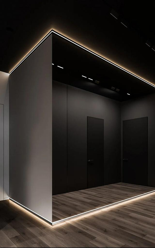 墻面的燈帶多是內(nèi)嵌式的,在一個(gè)合適的地方嵌入燈帶,讓平平無奇的墻面看起來很豐富,也很精致。墻面的燈帶還可以與頂面相連,效果更突出。