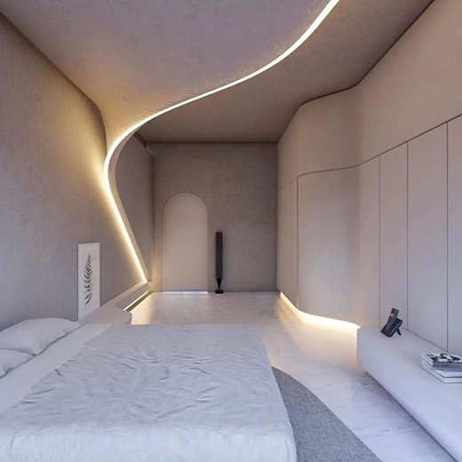 頂面的燈帶最常見的就是隱藏于跌級(jí)吊頂中,燈光效果比較柔和,能營(yíng)造溫馨舒適的室內(nèi)氛圍?;蛘呤歉鶕?jù)吊頂?shù)男问?,在某個(gè)邊設(shè)置燈帶,自動(dòng)成為視覺中心。