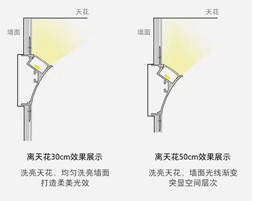其次,這種洗墻燈帶在安裝方式上可以向上或向下發(fā)光,通過(guò)墻面的漫反射均勻發(fā)光。光線柔和,形成水一樣沖刷墻面的效果,均勻照亮立面墻面,可以完美替代傳統(tǒng)的回形燈槽吊頂。它有很多應(yīng)用場(chǎng)景: