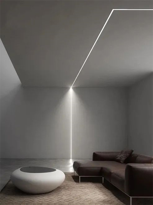 與以上三種做法相比,陽(yáng)角帶鋁槽的燈帶比較小?;景惭b在墻面的轉(zhuǎn)角處,可以解決陽(yáng)角處不同材料之間的封閉問(wèn)題,弱化墻面的邊角,具有很強(qiáng)的裝飾效果,提升空間的時(shí)尚氣質(zhì)。這種燈帶型材有陰角款和陽(yáng)角款兩種,更推薦陽(yáng)角款,顏值更高,功能更多。