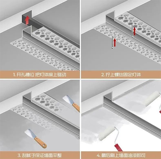 墻角鋁槽燈帶安裝簡(jiǎn)單:開(kāi)墻后安裝型材,固定型材,抹膩?zhàn)踊揖桶惭b完成了。