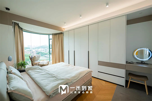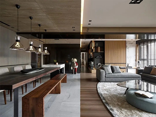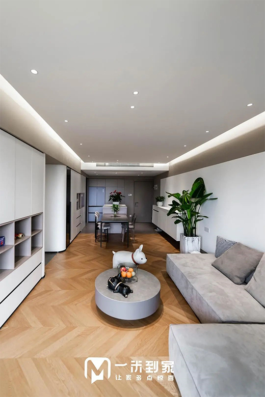 在天花板吊頂嵌入燈帶,也就是我們現(xiàn)在流行的“無主燈設(shè)計(jì)”,當(dāng)我們開燈后,光源帶由近到遠(yuǎn)的漸變,空間也隨之舒展。