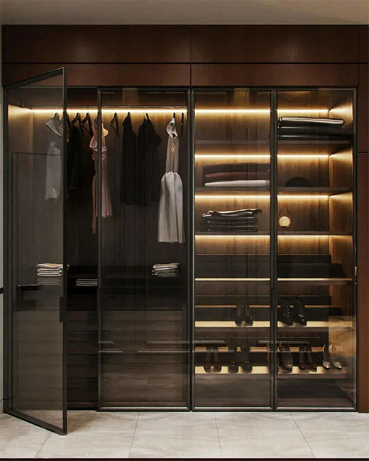 玻璃透視衣櫥的燈帶設(shè)計(jì),無論是作展示還是存放衣物,在光源底下的展示品和衣物都自帶“高級(jí)感濾鏡”。