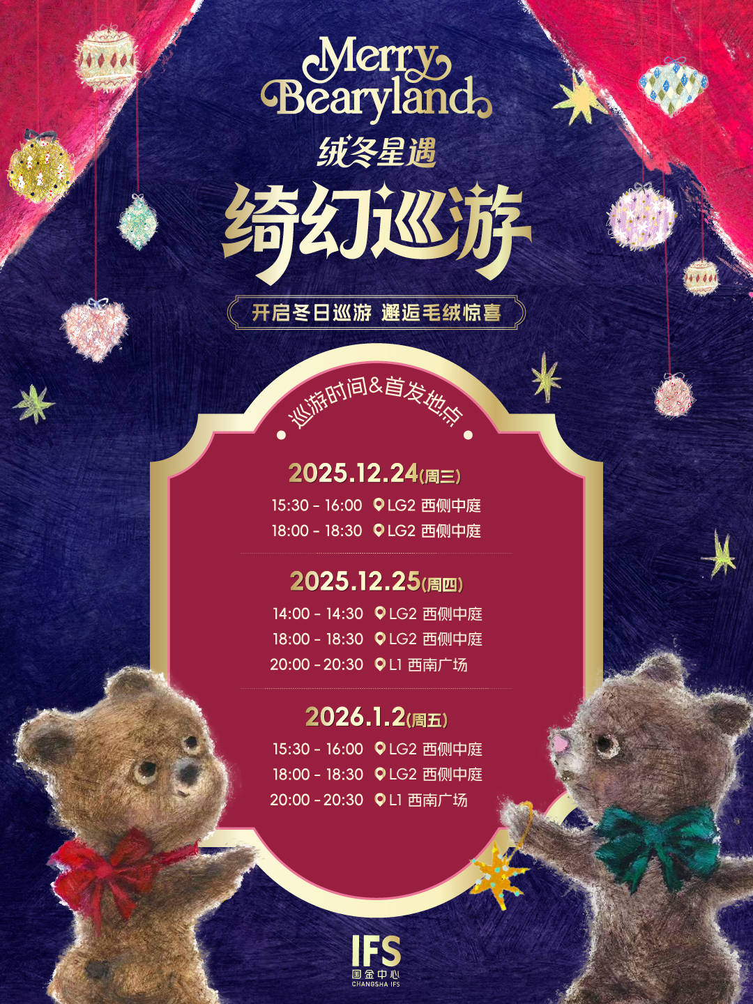 即日起至2026年1月4日,長(zhǎng)沙IFS將為大家送上毛絨絨冬日心意,打卡“Merry Bearyland 絨冬星遇”全國(guó)首展任意裝置,并關(guān)注長(zhǎng)沙IFS小紅書官方賬號(hào),拍照帶話題#毛絨絨冬日心意 發(fā)布小紅書平臺(tái),即可在LG2西側(cè)中庭裝置處獲得長(zhǎng)沙IFS定制冬日禮遇1份,數(shù)量有限,兌完即止。