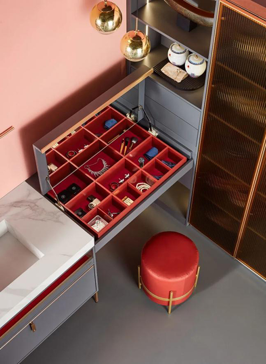 浪鯨衛(wèi)浴國潮系列定制浴室柜,它融合了中國風(fēng)元素搭配故宮紅,整個(gè)就很復(fù)古中式的調(diào)性,潮流又不失傳統(tǒng),家里的老人和孩子都很喜歡。同時(shí),還帶點(diǎn)輕奢范,橢圓長鏡的邊框框、垂直拉手與柜腳都用金色點(diǎn)綴,乳白色的臺面上暈染著國風(fēng)水墨畫般的紋路與硬朗的幾何線條相輔相成,即做到了潮流創(chuàng)新又融合傳承了中式復(fù)古,這番設(shè)計(jì)上的巧思也是很值得讓人夸贊一番了。