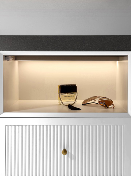 開放式儲物格,內(nèi)嵌感應(yīng)燈帶,于冷靜的白灰空間,注入活潑的暖色燈光作為點綴,在增加觀賞性的同時提高生活效率,豐富空間層次,帶來個性的情緒表達(dá)。