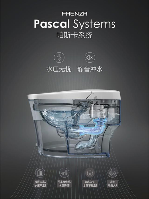 產(chǎn)品搭載FAENZA法恩莎創(chuàng)新研發(fā)的帕斯卡智能沖水系統(tǒng),突破高樓層與老舊城區(qū)水壓限制,無懼低水壓,同時實現(xiàn)靜音沖水。此外,還集成多項創(chuàng)新潔凈科技:凈瀾釉技術、智能潤壁功能、噴槍自潔功能、UV紫外線殺菌技術、銀離子抗菌座圈、水氣混合清洗技術等,如此完美的外觀+功能,讓其成為名副其實的年度爆款單品。