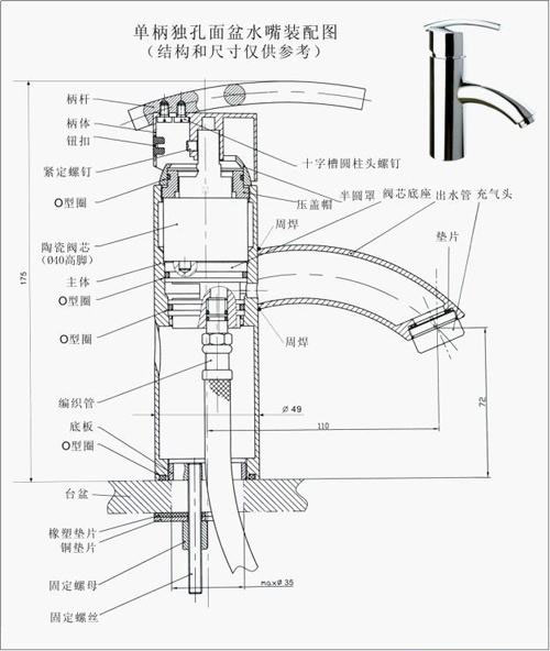 我們可以看到面盆的結(jié)構(gòu)圖還是非常的復(fù)雜的,它是單把陶瓷閥芯面,主要由手柄、閥芯、進水編織管和安裝小配件組成。其中還包括了一些密封圈,螺桿等等。