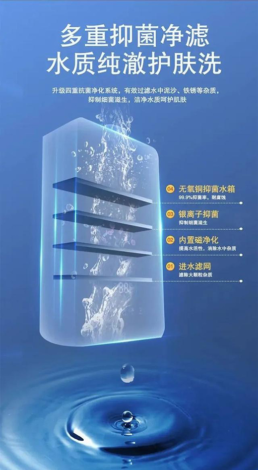 熱水器HX221A搭載四重凈水抑菌系統(tǒng),不僅層層過濾攔截水中雜質(zhì),還對水質(zhì)進(jìn)行高效滅菌抑菌處理,還原潔凈水質(zhì),呵護(hù)肌膚健康,為皮膚敏感人群、年幼寶寶、孕婦等筑起凈浴健康保護(hù)墻,同時降低不良水質(zhì)對熱水器的影響,延長使用壽命。